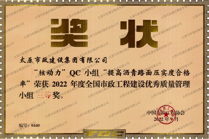 2022年度全國市政工程建設(shè)優(yōu)秀質(zhì)量管理小組三等獎_''核動力QC小組”提高瀝青路面壓實(shí)度合格率”